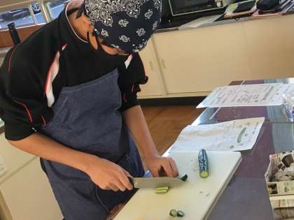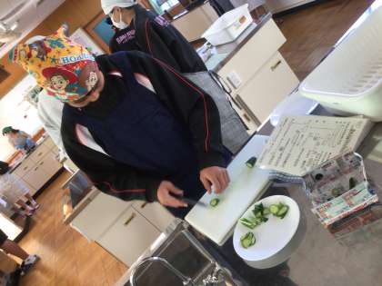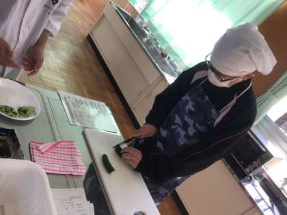 一人一本のきゅうりを用いて、乱切りや短冊切りなど、計6種類の包丁さばきに挑戦しました。