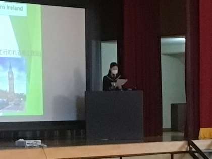 イギリスのダービーシャーでのホームステイや学校生活を通して感じたことや、自身の研究テーマについて調査した結果とその考察について、プレゼンテーションされました。
