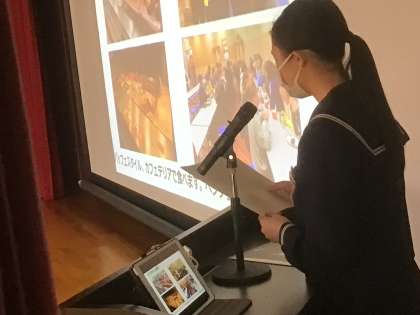 10月に実施された中学生海外派遣に赴いた代表生徒による報告が全校生徒に向けて行われました。