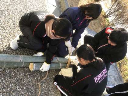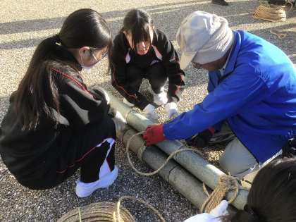 校内整備員さんを講師にお招きし、門松を縄で七本、五本、三本と縁起の良い数で束ねていきました。