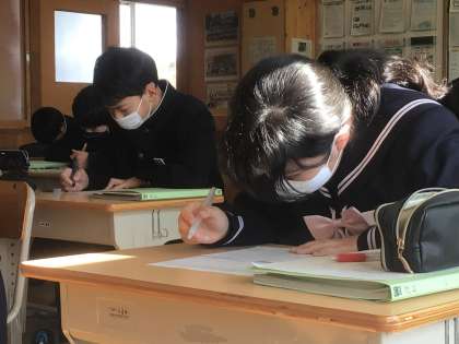 上の写真は、理科の授業の様子です。学習診断テストに向けて、これまでの学習内容をテスト形式で総復習しています。