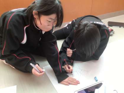 上の写真は、装飾スタッフが掲示物にするイラストをB紙に下書きをしているところです。