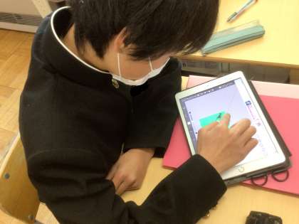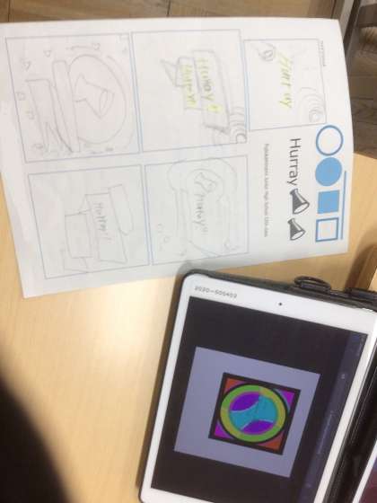 学習用タブレットを使い、自分がイメージしたデザインに着彩して作品に仕上げました。自分の作品を共有の場にアップロードすることで、仲間とお互いに作品を見せ合い、感想を述べ合う姿が見られました。また、生徒たちからは「ラフスケッチからどんどん変わっていったけれど、自分でも納得いくものができました」という声が聞かれました。