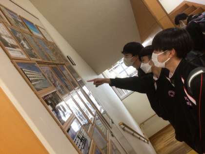 下の写真は、展示された仲間の美術作品の良さを楽しんでいる生徒たちの様子です。