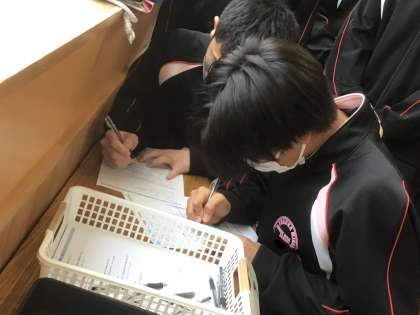 本日の朝から、さっそく生地に触ったりデザインを見比べたりしながら、アンケートに記入する生徒たちの姿が見られました。「締め方がわからないけれど、ネクタイは何かかっこいいからしてみたい」「ブレザーは高校生みたいで大人っぽい感じがするから着てみたい」など、期待感を高めている生徒たちの言葉が聞かれました。