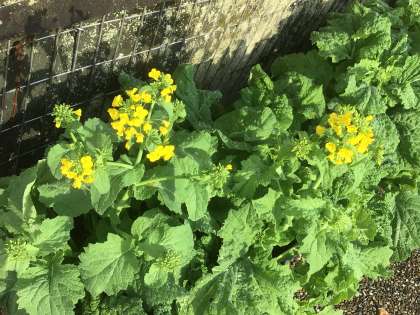中央の写真は、菜の花です。今日は気温が高く、ミツバチが花粉を集めに飛来する姿が見られました。