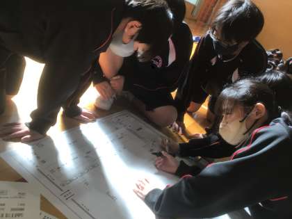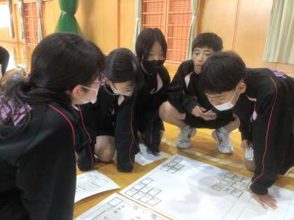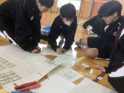 1年生が総合的な学習で、防災対策課の方を講師にお招きし、HUG(避難所運営ゲーム)を通して、災害時の安全確保や人権について考えを深めました。