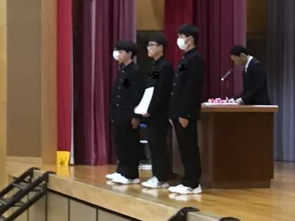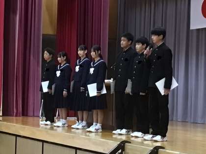 上の写真は、次年度前期生徒会役員認証です。生徒会長から、自分たちで企画して達成する満足感を学校全体で味わいたい、と意気込みが語られました。