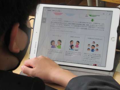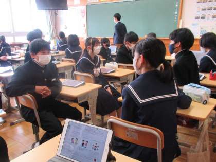 Teamsで配信された保健だよりを読んで、クラスメイトとコミュニケーションの大切さについて話し合っています。