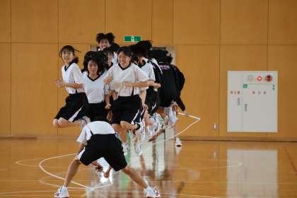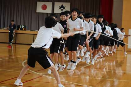 体育祭の競技練習が盛り上がっています。あいにくの雨で、グラウンドで練習ができませんでしたが、体育館で長縄跳びを行っています。どのクラスも声を合わせて、跳んでいます。