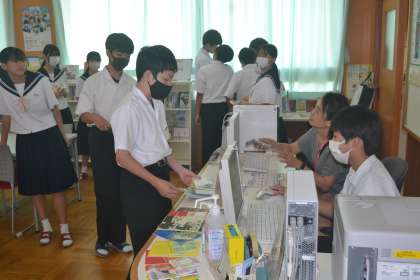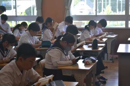 朝の短学活では、黙々と読書をする様子があります。また、図書館には、学級で本を借りに行く時間が割り当てられているので、多くの生徒が本を借りやすい環境になっています。