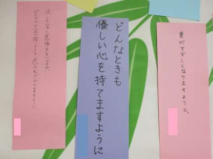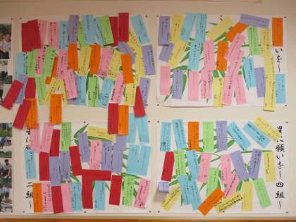 2年生の学年掲示板には、一人一人が短冊に願いを書いて掲示しています。