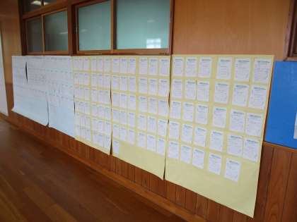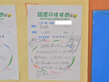 図書広報委員の企画で図書室前には、全校の一人一人が書いた「読書のすすめ」が掲示しています。