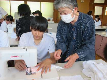 7月22日に、地元の高齢者クラブの方と、3年生のボランティア参加者で雑巾づくりを行いました。合計で140枚程度作り、そのうち50枚を本校に寄付しました。残りは、地域で活用するそうです。