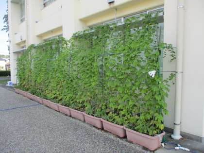 6月17日に、愛知県緑化センターよりゴーヤの苗をいただき、ボランティアを募って苗を入れました。
