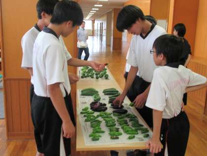 緑のカーテンボランティアで苗から育てたゴーヤ。その他にも、キュウリ、シシトウ、ナスなど藤岡南中で育てた野菜が収穫されました。