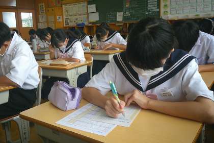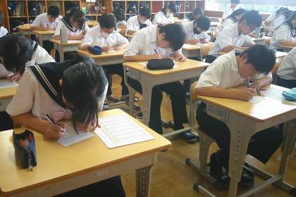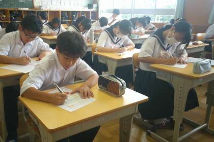 後期中間テストに向けて、数学や英語の基礎学力を伸ばすことを目的としています。朝の短学活の時間に100マス計算や、学習用タブレットを用いた英単語早押しクイズを行っています。