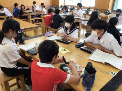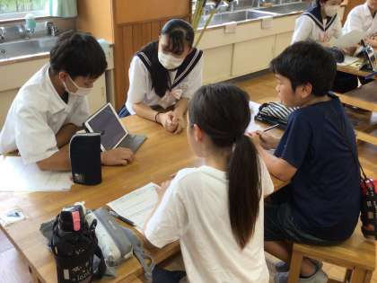 1年生は、SDGsについてのこれまでの学びをまとめたポスターを生かしながら相手にその魅力が伝わるようにプレゼン発表しました。その中で、どのようにすればより相手に伝わりやすいまとめができるのかを、小学生に優しくアドバイスしていました。