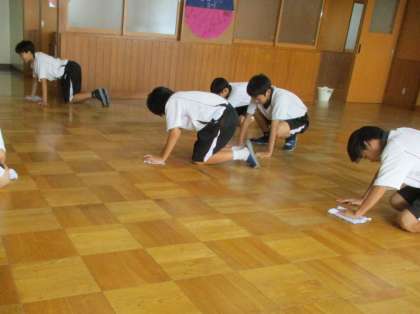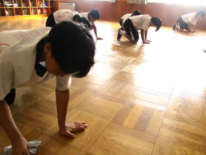 帰りの会後に、環境委員とボランティアの生徒が床を磨いた後に、丁寧にワックスをかけました。