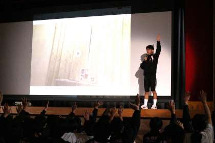 体育館に全校が集まり、生徒会を中心として全校生徒でふれあいフェスティバルに向けて士気を高めました。