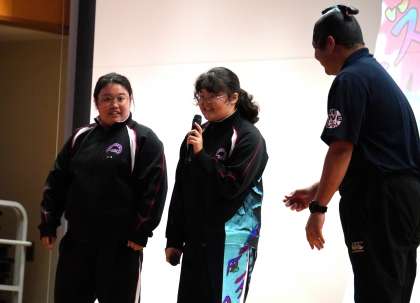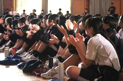 体育館に全校が集まり、生徒会を中心として全校生徒でふれあいフェスティバルに向けて士気を高めました。