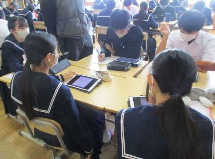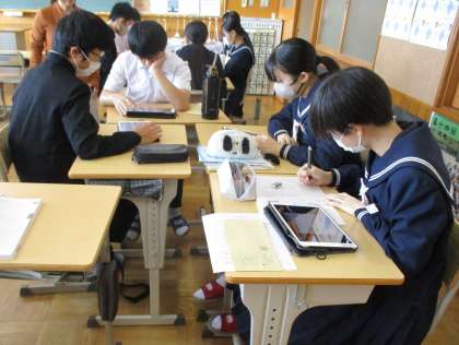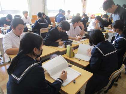 3年生では、朝の短学活でテスト勉強を行っていました。班で、教え合いながら学習する雰囲気を高めています。