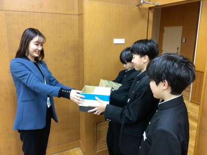 本日、10月27日(日)のふれあいフェスティバルまでに集めた文房具を、明治安田生命の方に寄付しました。集めた文房具が多くの人の役に立つことを願っています。