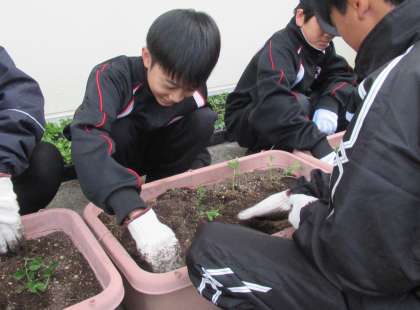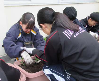 生徒会の公約の一つである「花いっぱいの学校づくり」を実現するために、スイートピー苗植えボランティアを実施しました。