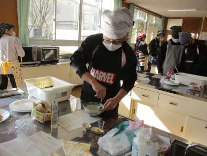 「スイートポテト」、「チョコパイ」を仲間と食材や調味料の量を確認し合いながら調理しました。