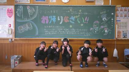2年生が自然教室を終えて、久しぶりに教室へ入ると黒板に温かなメッセージとイラストが描かれていました。