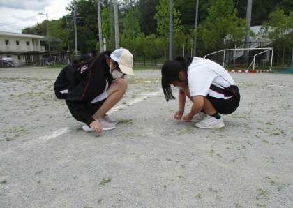 FMCUとは、「藤岡南クリーンアップ」の略です。体育祭に向けて、団ごとにグラウンドの草取りや石拾いを自分たちで行っています。