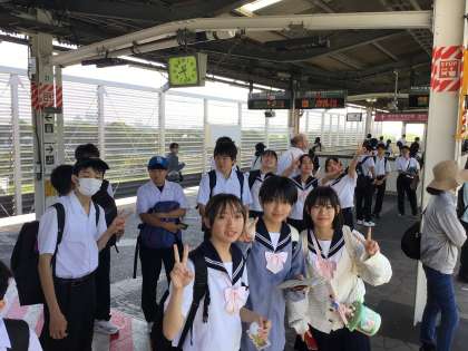 快晴の舞浜です。今から班別活動に出発します!朝の通勤ラッシュと同じタイミングですが、班で協力しながら目的地まで向かいます。