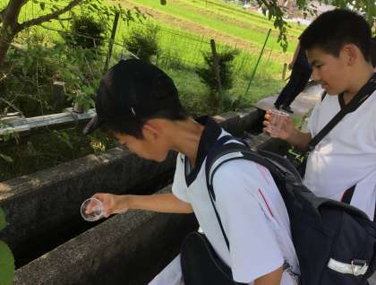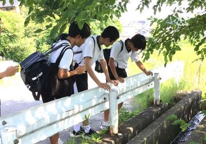 環境委員では、地域の方と協力して西中山川にホタルを増やすためにホタルの幼虫の餌となる「カワニナ」を学校で育成しています。本日は、委員会の時間に西中山川に学校で育成したカワニナを放流しました。