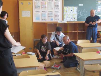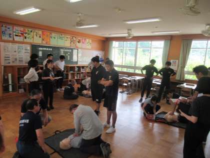 生死にかかわる事故を想定したシミュレーション研修を通して、患者を救急隊員に引き渡すまでの役割分担を確認し、速やかに教職員が連携をとり、落ち着いた対応ができるようにすることを目的に行われました。
