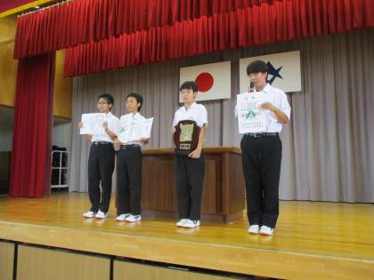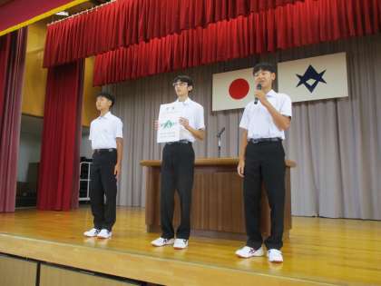 教育委員会表彰や表彰披露を行った後、7月に高齢者クラブの方々と3年生の有志とで製作した「ぞうきん」について紹介されました。意見発表では、2年生の代表生徒から、4月からこれまでの学年や学級の様子をもとに今後の抱負が語られました。自分一人でなく、全校や学年、南中生みんなで頑張りたいという思いが力強く語られました。