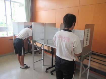 模擬立候補者ごとに公約を設定し、実際に使用されているものと同じ投票箱や記載台を使用しました。また、各学級ごとに選挙管理委員を選出し、受付や投票済証の配付も行うなど、実際の選挙にかなり近い環境で行われました。生徒は、放課やお昼休みなど、投票できる時間に投票会場に足を運んで投票を行うことで、国政選挙や地方選挙などのイメージを深め、将来の投票意欲を高める学習となりました