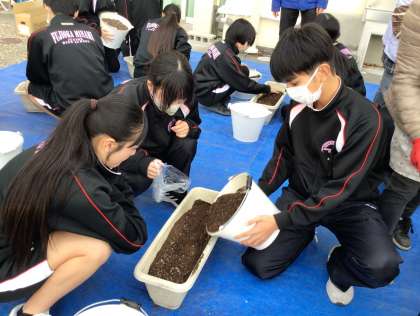 環境委員会では、手分けしてチューリップの球根をプランターに植えました。春頃、花を咲かせるのが楽しみです。