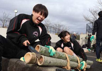 この日は、3年生の有志が中心となって門松づくりを行いました。冬休みに入る前から、竹を切るなど準備を進めており、この日は飾り付けを行いました。