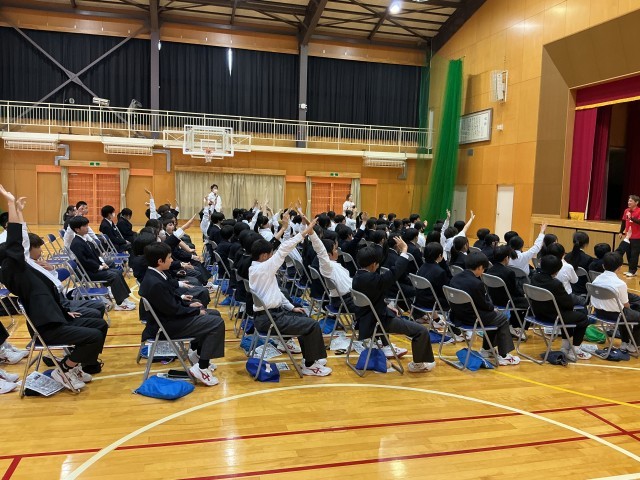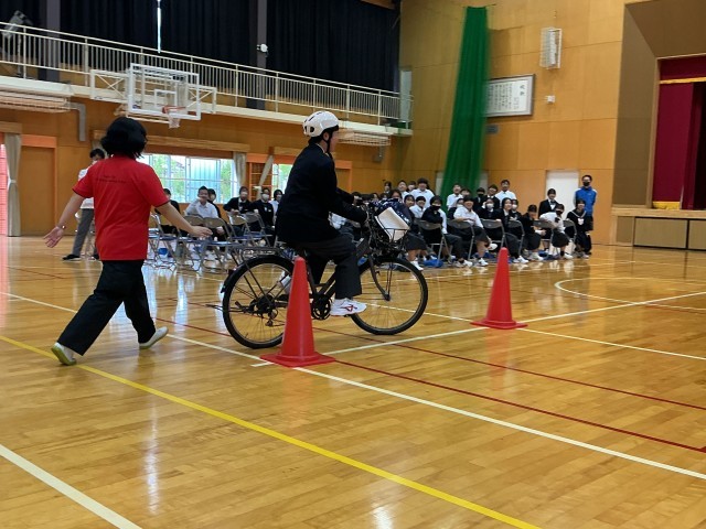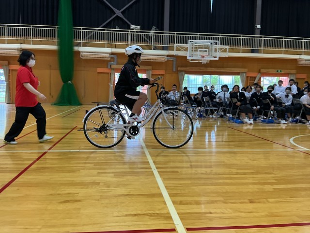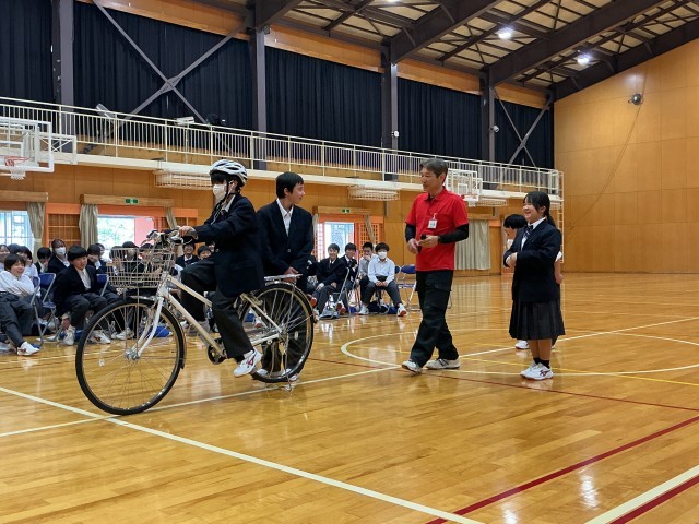 5・6時間目に豊田市交通安全学習センターから講師をお招きして、自転車に関わる交通安全についての学習会を行いました。自転車通学者だけではなく中学生にとって自転車は大切な移動手段です。被害者にも加害者にもならないようにしっかりと知識を深めました。後半は、実際の自転車を使って、自転車点検の方法(“ぶたはしゃべる“)や危険な自転車の乗り方体験を行い、身をもって正しく自転車に乗ることの重要性を実感しました。