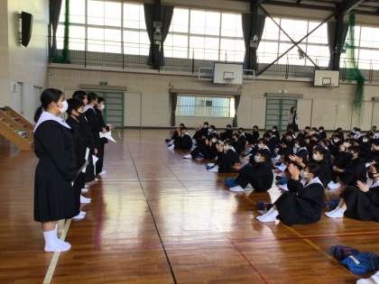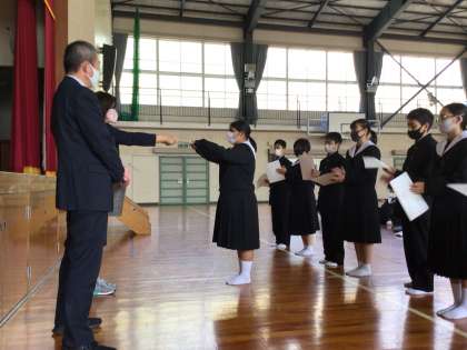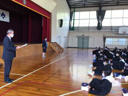 1年生の前期級長、代議員、書記の認証式を行いました。代表の生徒も他の生徒たちも、真剣な表情でした。緊張感が、伝わってきました。