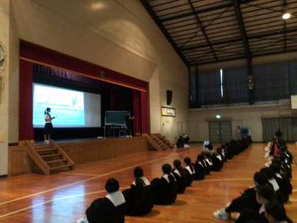 1年生は、体育館で、2、3年生は教室でリモートにて行っています。