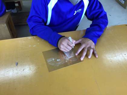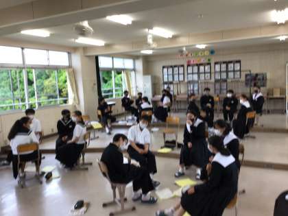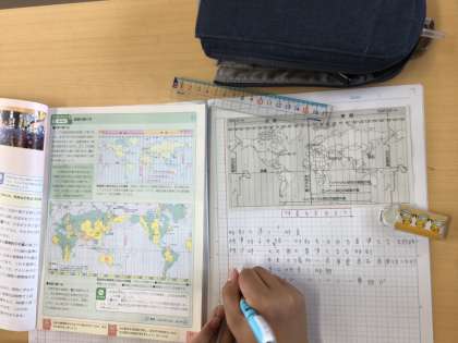 授業の様子です。ノートの書き方、作業、タブレットの活用、グループ活動など、コロナ対策をして行っています。