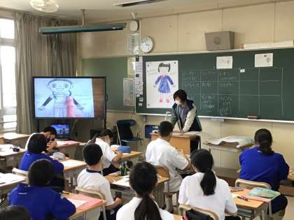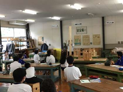 技術室(木工室)での授業です。家庭科の授業は、電子黒板を使って生徒の作品を写して意見を発表しています。