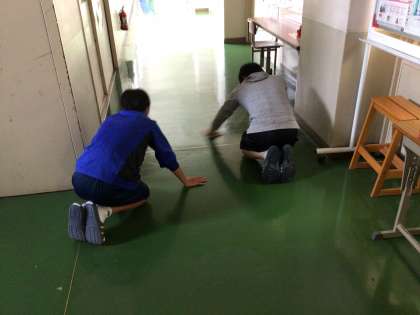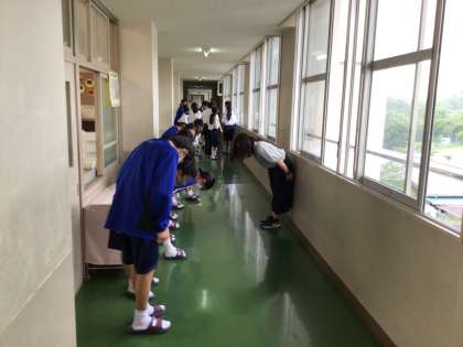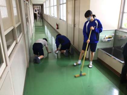 清掃活動の様子です。あいさつをしてから無言で取り組みます。教師も一緒に行います。