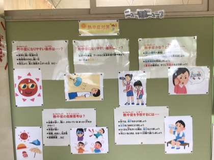 保健室前の掲示板には、熱中症の資料が掲示されています。生徒にも意識を高めています。