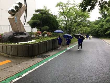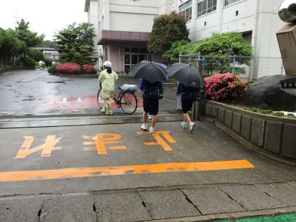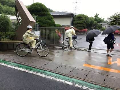 朝の登校の様子です。自転車通学の生徒は、カッパを着て運転します。雨の日は特に気をつけて登下校してください。