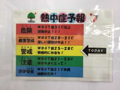 朝から気温が上がっています。熱中症の基準を職員室に設置しています。すでに警戒レベルです。