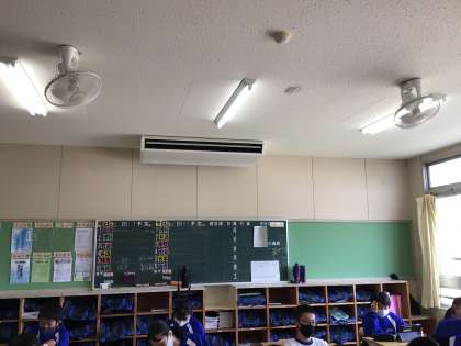 校内には、熱中症のレベル表情をし、教室には温度計を設置しています。すでに気温が高くなり、エアコンと扇風機を使っています。