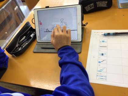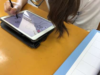 タブレットを使って保見中CMづくりをしています。タブレットを使いこなしています。