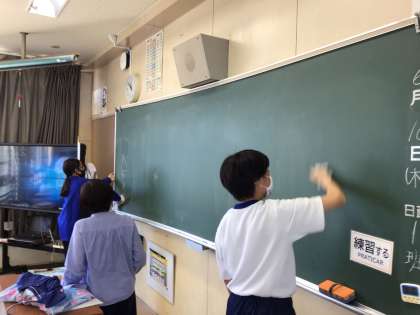 学級の係りの生徒が黒板をきれいにしたり、教材を集めたりしています。
